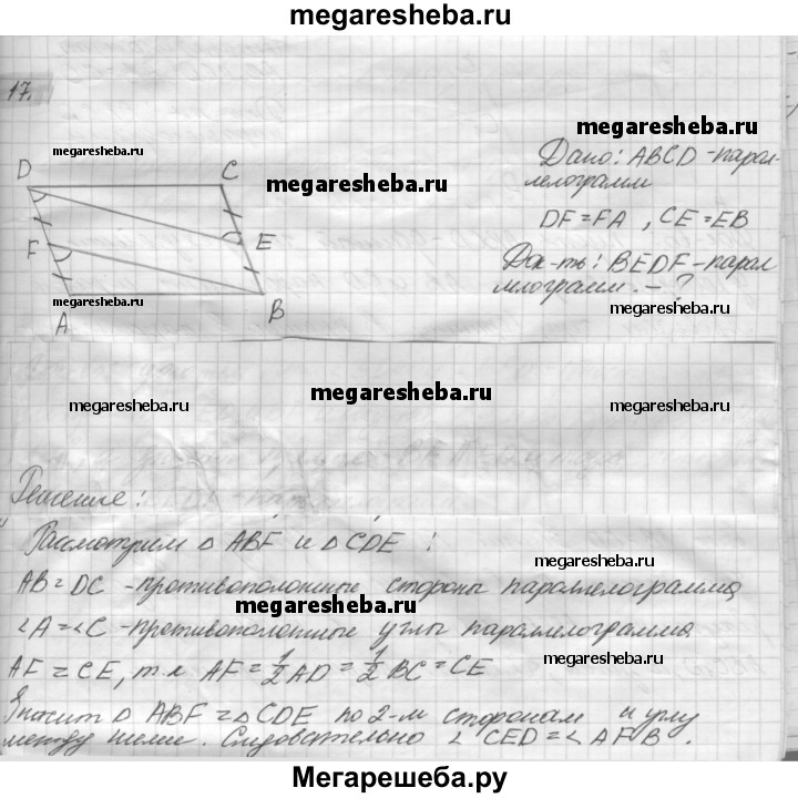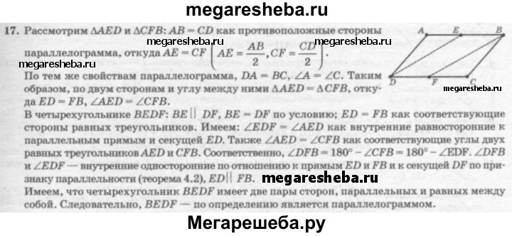 17. В параллелограмме ABCD точка Е — середина стороны ВС, а F — середина стороны AD. Докажите, что четырёхугольник BEDF — параллелограмм.