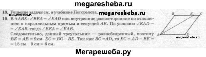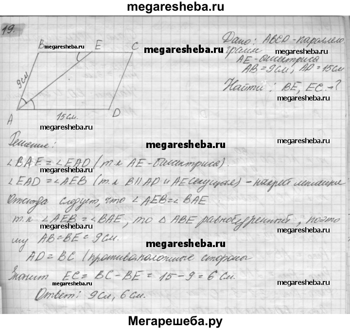19. В параллелограмме ABCD проведена биссектриса угла А, которая пересекает сторону ВС в точке Е. Чему равны отрезки BE и ЕС, если АВ = 9 см, AD = 15 см?