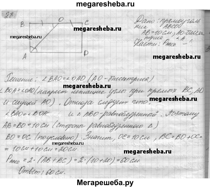 28. Биссектриса одного из углов прямоугольника делит сторону прямоугольника пополам. Найдите периметр прямоугольника, если его меньшая сторона равна 10 см.