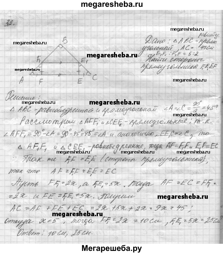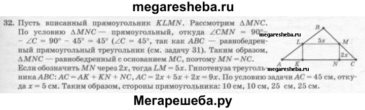 32. В равнобедренный прямоугольный треугольник вписан прямоугольник так, что две его вершины находятся на гипотенузе, а две другие — на катетах (рис. 144). Чему равны стороны прямоугольника, если известно, что они относятся как 5:2, а гипотенуза треугольника равна 45 см?