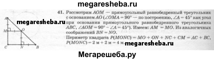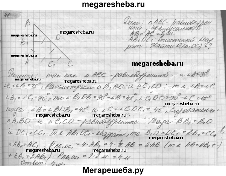 41. В равнобедренный прямоугольный треугольник, каждый катет которого 2 м, вписан квадрат, имеющий с ним общий угол. Найдите периметр квадрата.