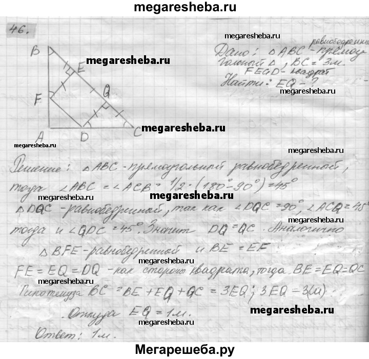 46. В равнобедренный прямоугольный треугольник вписан квадрат так, что две его вершины находятся на гипотенузе, а другие две — на катетах. Найдите сторону квадрата, если известно, что гипотенуза равна 3 м.
