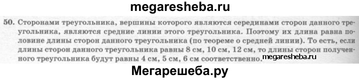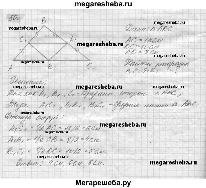 50. Стороны треугольника равны 8 см, 10 см, 12 см. Найдите стороны треугольника, вершинами которого являются середины сторон данного треугольника.