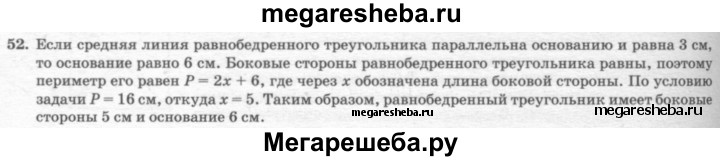 52. Средняя линия равнобедренного треугольника, параллельная основанию, равна 3 см. Найдите стороны треугольника, если его периметр равен 16 см.