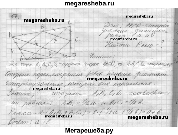 57. У четырёхугольника диагонали равны а и b. Найдите периметр четырёхугольника, вершинами которого являются середины сторон данного четырёхугольника.