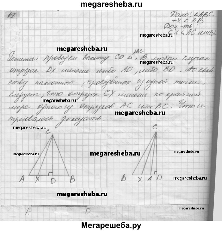 19. На стороне АВ треугольника ABC взята точка X. Докажите, что отрезок СХ меньше по крайней мере одной из сторон АС или ВС.