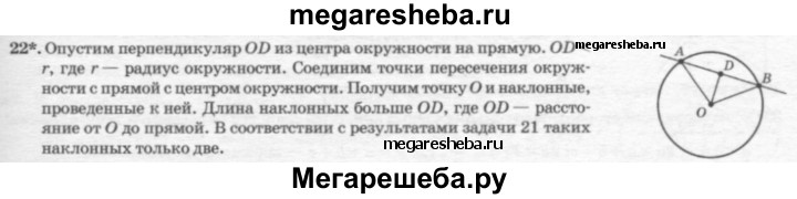 22. Докажите, что прямая, отстоящая от центра окружности на расстояние, меньшее радиуса, пересекает окружность в двух точках.