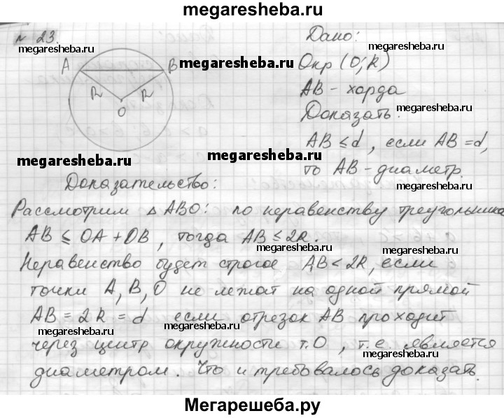 23. Докажите, что любая хорда окружности не больше диаметра и равна диаметру только тогда, когда сама является диаметром.