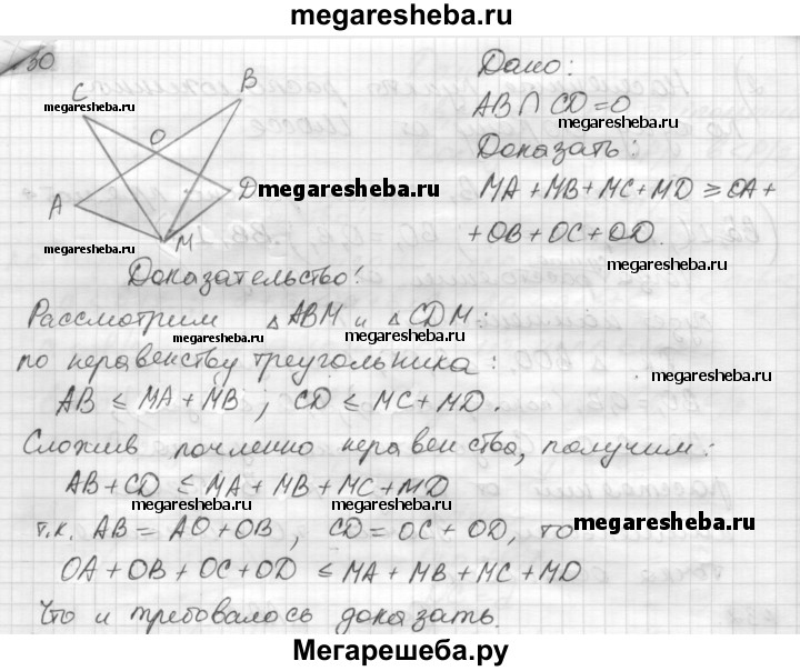 30. Отрезки АВ и CD пересекаются в точке О. а) Докажите, что сумма расстояний от любой точки плоскости до точек А, В, С и D не меньше чем OA + ОВ + ОС + OD.