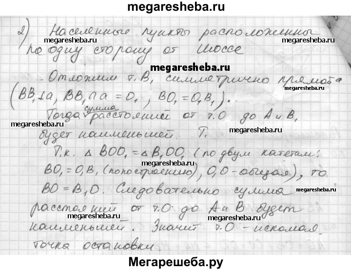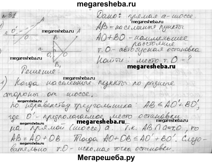 31. На прямолинейном шоссе требуется указать место автобусной остановки так, чтобы сумма расстояний от неё до населённых пунктов A и В была наименьшей. Рассмотрите два случая: 1) пункты расположены по разные стороны от шоссе (рис. 166, а); 2) пункты расположены по одну сторону от шоссе (рис. 166, б).