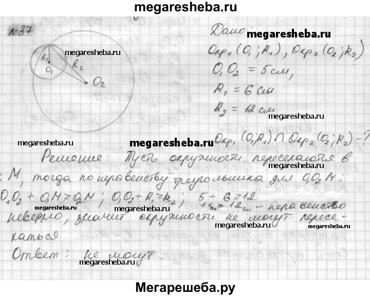 37. Могут ли пересекаться окружности радиусами 6 см и 12 см, центры которых находятся на расстоянии 5 см? Объясните ответ.