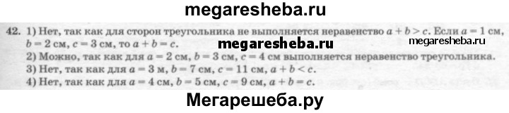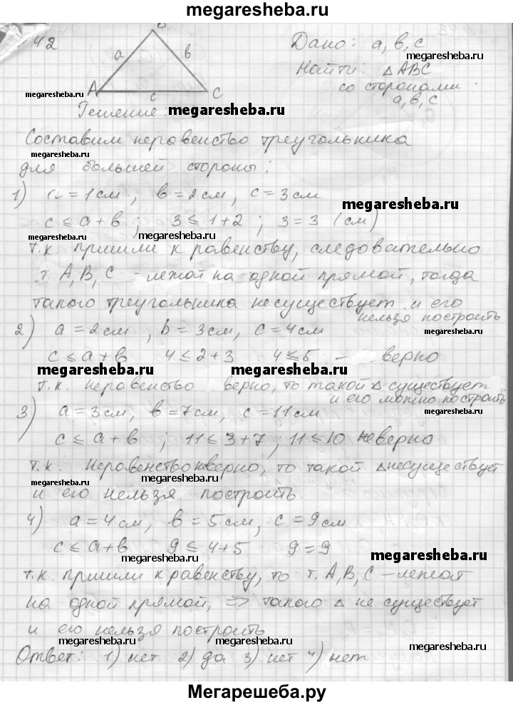 42. Можно ли построить треугольник со сторонами: 1) а = 1 см, b = 2 см, с = 3 см; 2) а = 2 см, b = 3 см, с = 4 см; 3) а = 3 см, b = 7 см, с = 11 см; 4) а = 4 см, b = 5 см, с = 9 см?