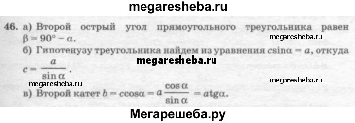 46. В прямоугольном треугольнике катет равен а, а противолежащий ему угол а. Найдите второй острый угол, противолежащий ему катет и гипотенузу.