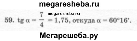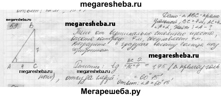 59 Тень от вертикально стоящего шеста, высота которого 7 м, составляет 4 м. Выразите в градусах высоту солнца над горизонтом (рис. 169).