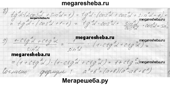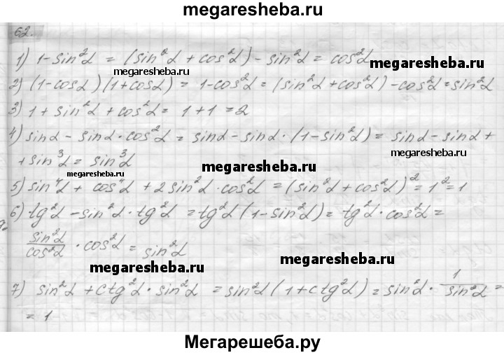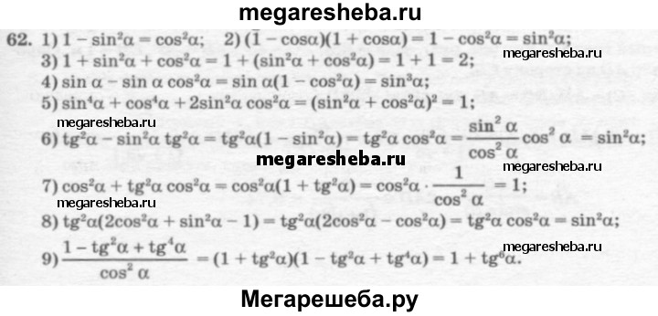 62 Упростите выражения: 1) 1 - sin2 а; 2) (1 - cosα)(l + cos α); 3) 1 + sin2 α + cos2 α; 4) sin α - sin α cos2 α; 5) sin4 α + cos4 α + 2sin2 α cos2 α; 6) tg2α - sin2 α tg2α; 7) sin2 α + ctg2 α sin2 α; 8) tg2α (2cos2α + sin2α - 1); 9) 1 - ctg2α + ctg4α/sin2α