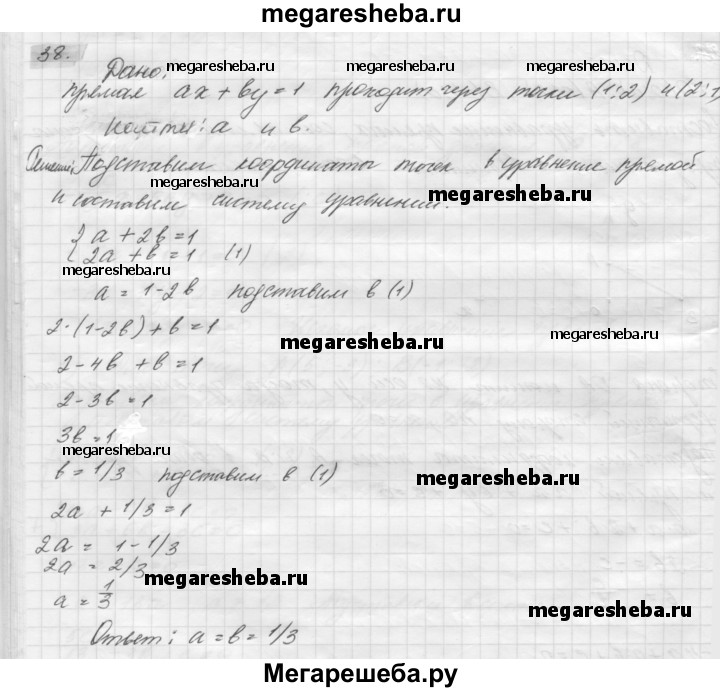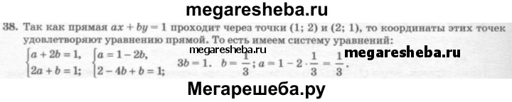 38. Чему равны коэффициенты а и b в уравнении прямой ах + by = 1, если известно, что она проходит через точки (1; 2) и (2; 1)?