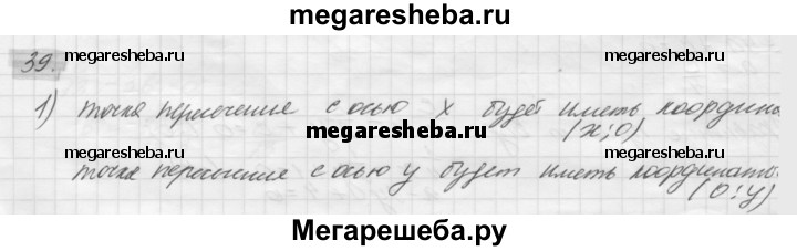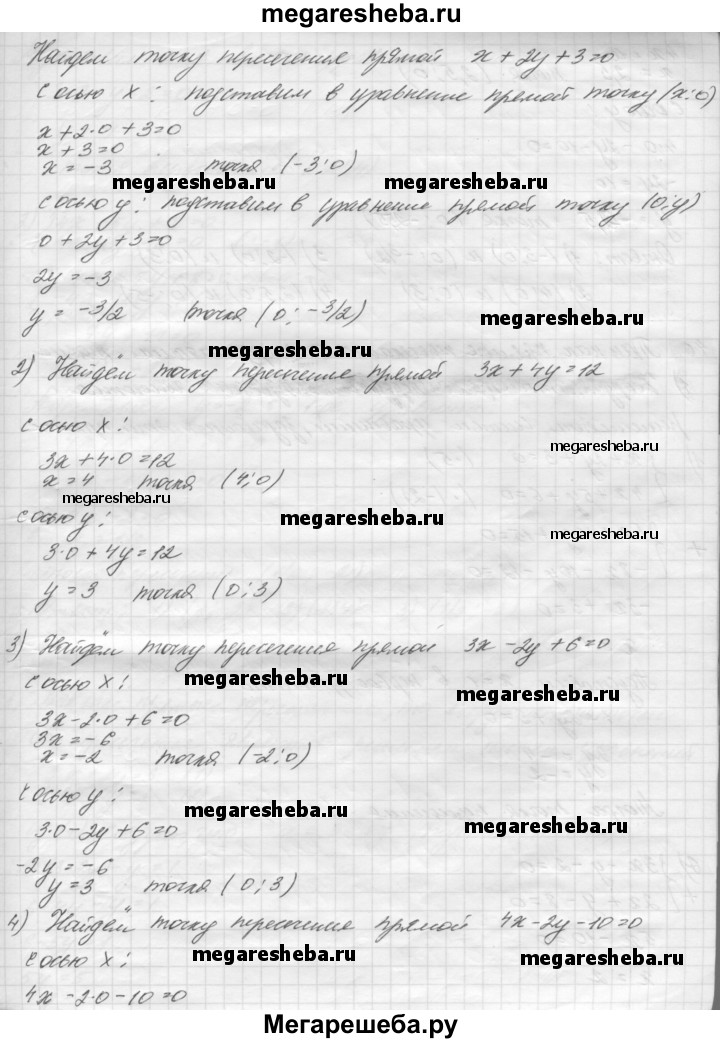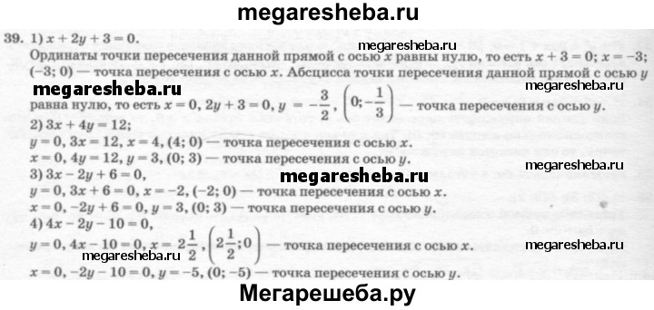 39. Найдите точки пересечения с осями координат прямой, заданной уравнением: 1) х + 2у + 3 = 0; 2) 3х + 4у = 12; 3) 3х - 2у + 6 = 0; 4) 4х - 2у - 10 = 0.