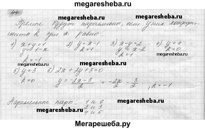 44. Среди прямых, заданных уравнениями, укажите пары параллельных прямых: 1) х + у = 1; 2) у = х - 1; 3) х - у = 2; 4) у = 4; 5) у = 3; 6) 2х + 2у + 3 = 0.