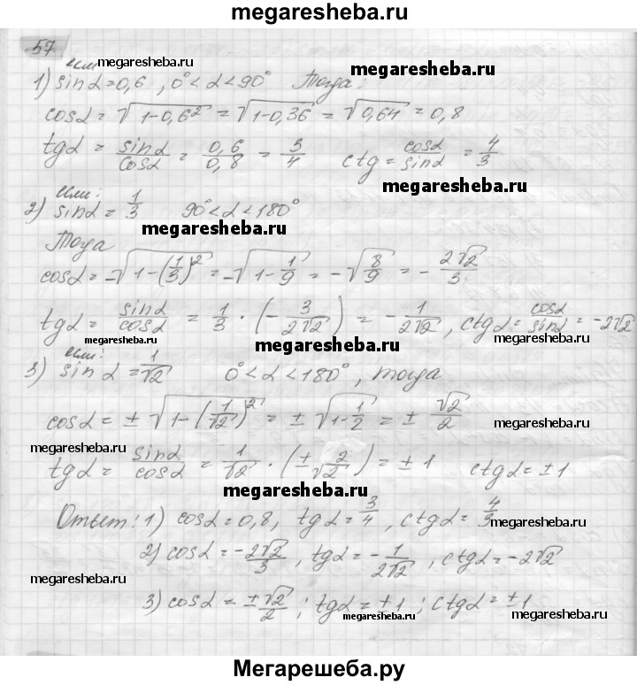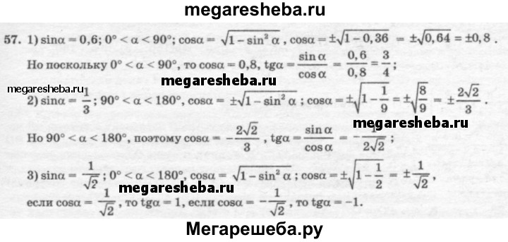 57. Найдите cosα и ctgα, если: 1) sinα = 0,6, 0° < a < 90°; 2) sinα = 1/3, 90° < a < 180°; 3) sinα = √2/2 0° < a < 180°.