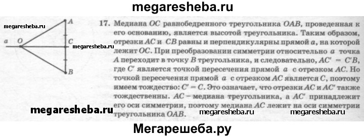 17. Докажите, что прямая, содержащая медиану равнобедренного треугольника, проведённую к основанию, является осью симметрии треугольника.