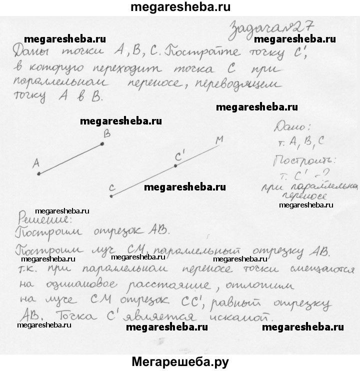27. Даны точки А, В, С. Постройте точку С', в которую переходит точка С при параллельном переносе, переводящем точку А в В.