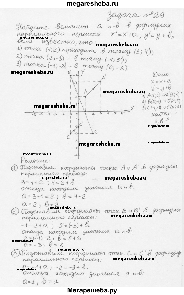 29. Найдите величины а и b в формулах параллельного переноса х' = х + а, у' = у + b, если известно, что: 1) точка (1; 2) переходит в точку (3; 4); 2) точка (2; -3) — в точку (-1; 5); 3) точка (-1; -3) — в точку (0; -2).