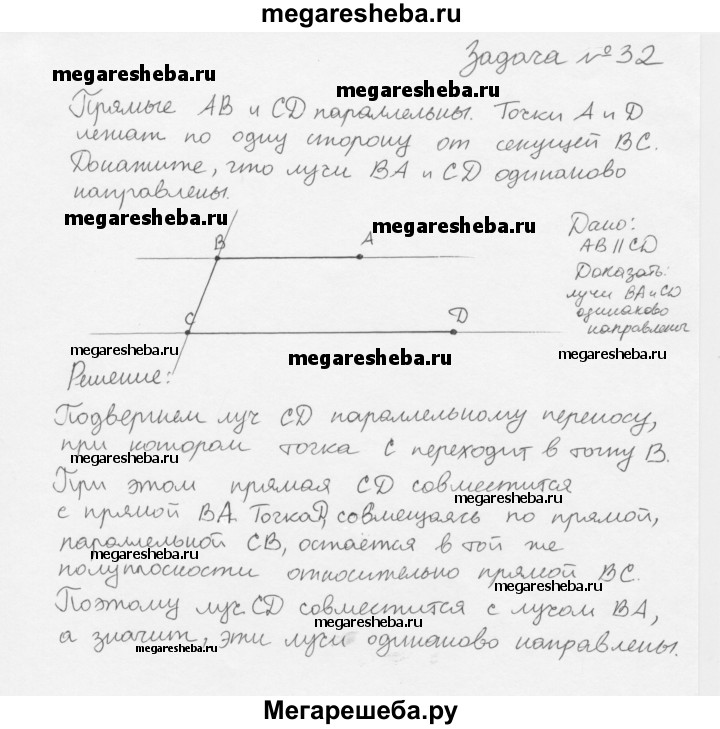 32. Прямые АВ и CD параллельны. Точки А и D лежат по одну сторону от секущей ВС. Докажите, что лучи ВА и CD одинаково направлены.
