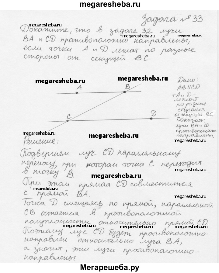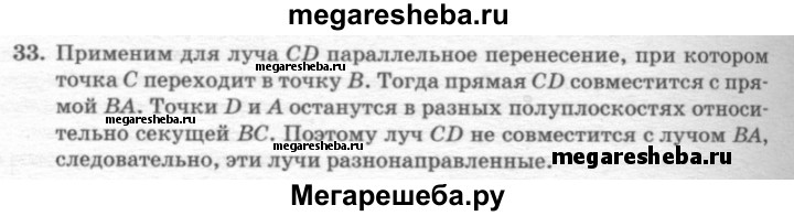 33. Докажите, что в задаче 32 лучи ВА и CD противоположно направлены, если точки А и D лежат по разные стороны от секущей ВС.