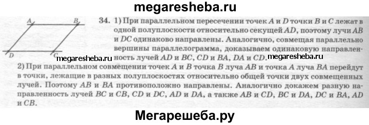 34. Четырёхугольник ABCD — параллелограмм. Среди лучей АВ, ВА, ВС, СВ, CD, DC, AD, DA назовите пары одинаково и противоположно направленных лучей.