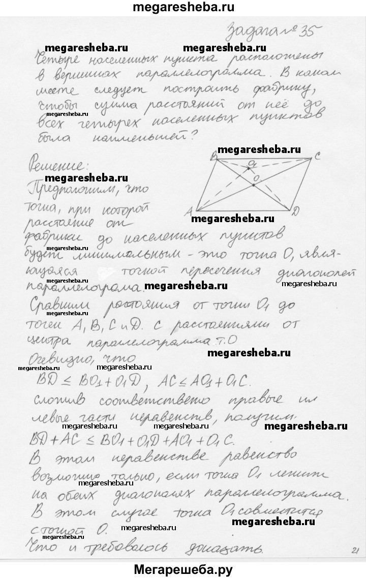 35. Четыре населённых пункта расположены в вершинах параллелограмма. В каком месте следует построить фабрику, чтобы сумма расстояний от неё до всех четырёх данных пунктов была наименьшей?