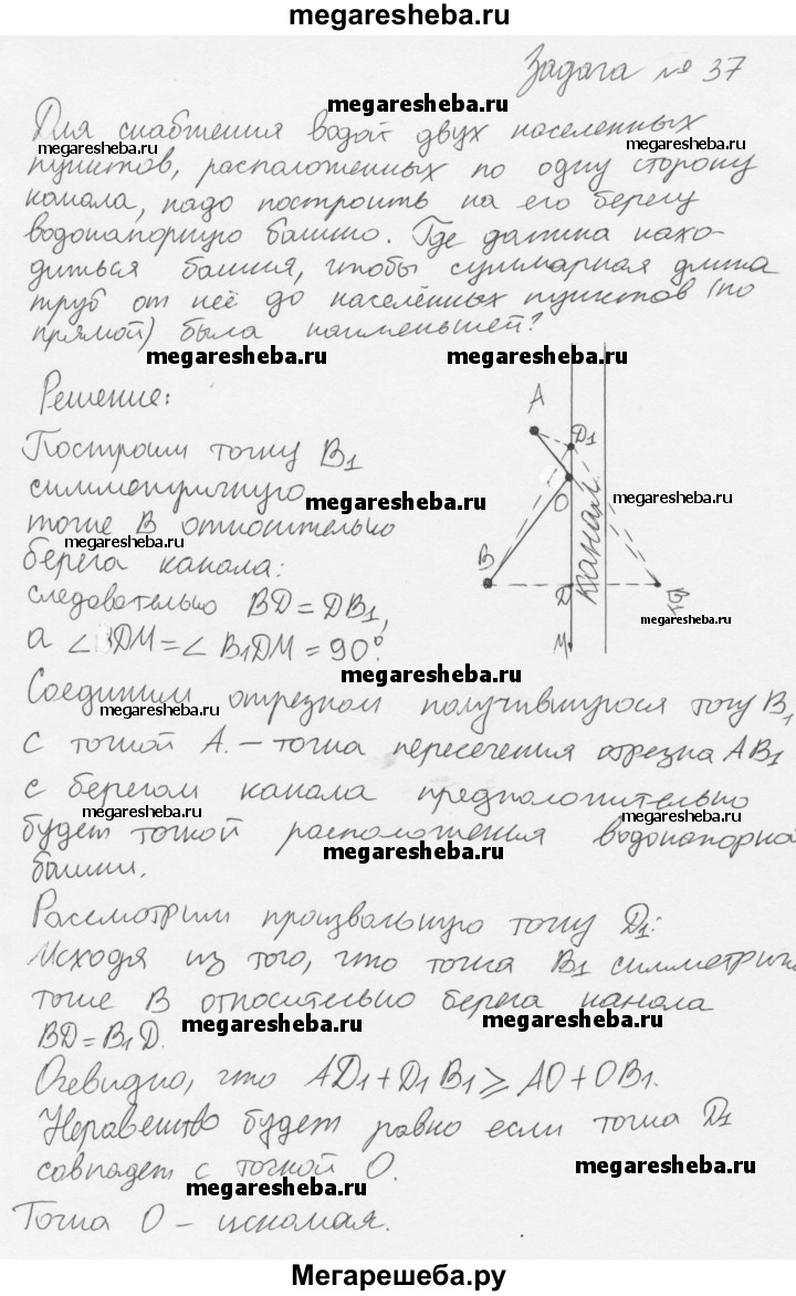 37. Для снабжения водой двух населённых пунктов, расположенных по одну сторону канала, надо построить на его берегу водонапорную башню. Где должна находиться башня, чтобы суммарная длина труб от неё до населённых пунктов (по прямой) была наименьшей?
