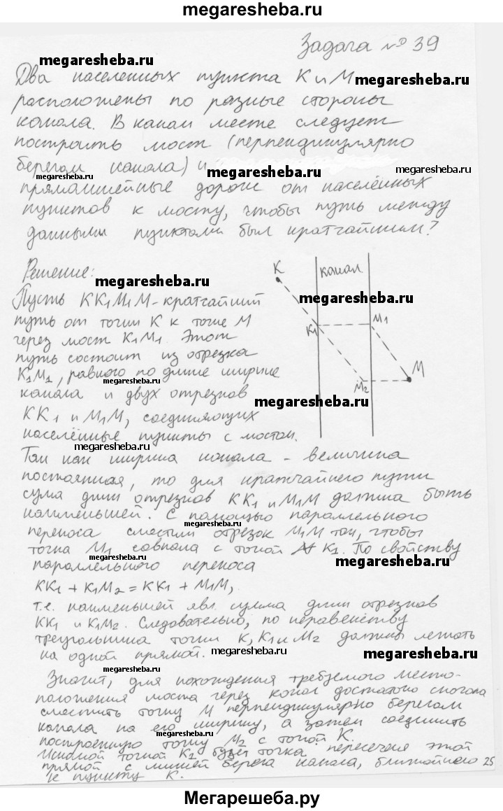 39. Два населённых пункта К и М расположены по разные стороны канала. В каком месте следует построить мост (перпендикулярно берегам канала) и прямолинейные дороги от населённых пунктов к мосту, чтобы путь между данными пунктами был кратчайшим?