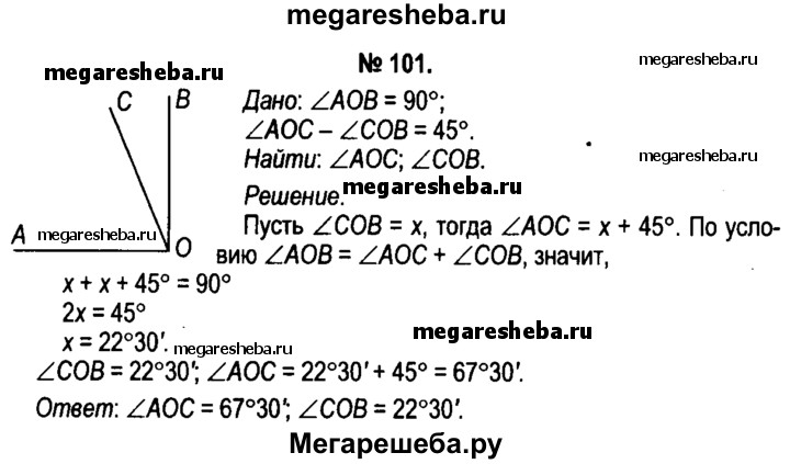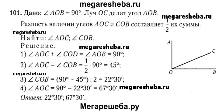 101. Луч ОС делит прямой угол АОВ на два угла. Вычислите градусные меры углов АОС и СОВ, если известно, что их разность составляет половину их суммы.
