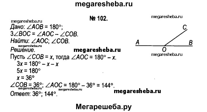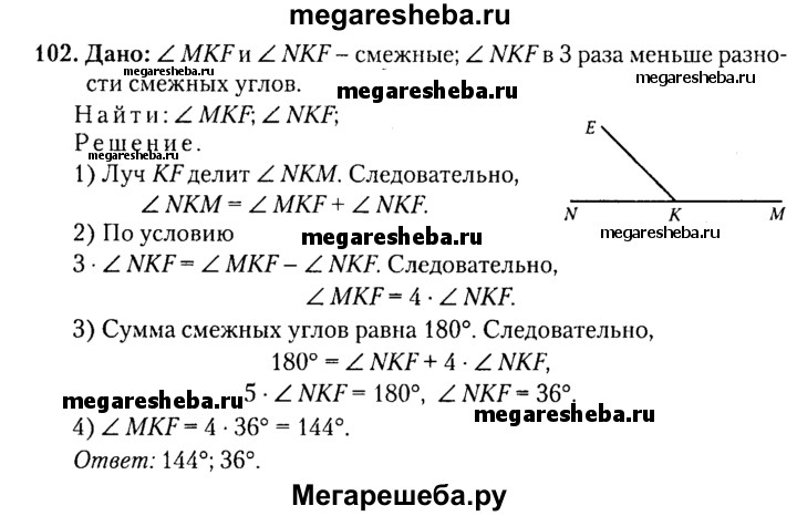 102. Градусная мера меньшего из смежных углов в три раза меньше разности градусных мер этих смежных углов. Вычислите градусные меры смежных углов.