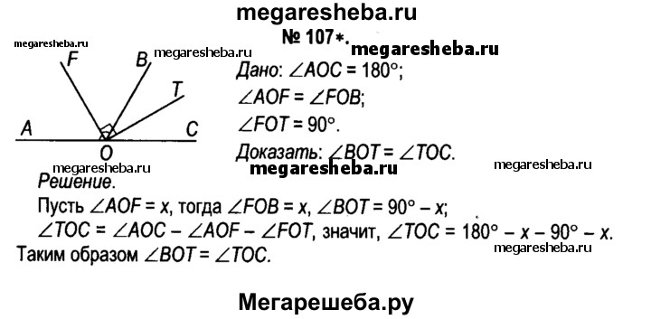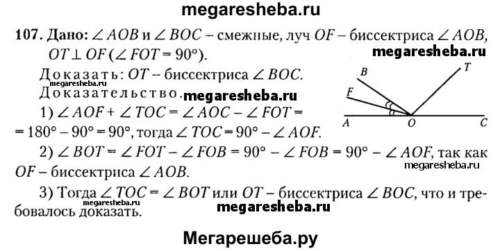 107. Углы АОВ и ВОС — смежные, луч OF — биссектриса угла АОВ, а луч ОТ лежит во внутренней области угла ВОС и перпендикулярен лучу OF. Докажите, что луч ОТ — биссектриса угла ВОС.