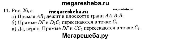 11. На рисунке 26, в изображен куб и прямые, проходящие через его вершины, а) Назовите грань куба, в плоскости которой лежит прямая АВ₁, б) Назовите точку пересечения прямых DF и D₁C₁. в) Верно ли, что прямые DF и СС₁ пересекаются в точке С₁?