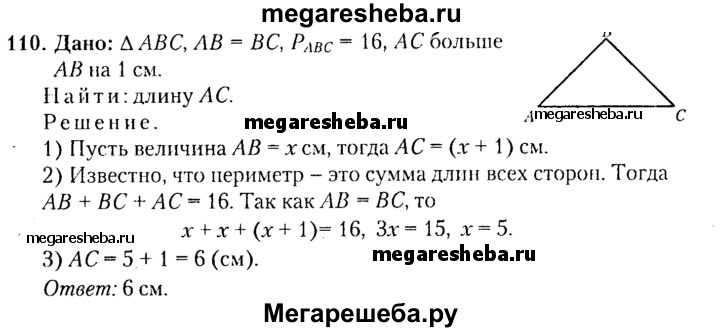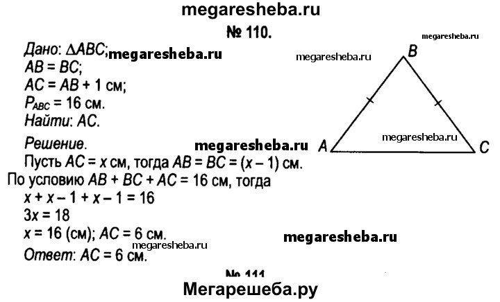 110. Стороны АВ и ВС треугольника ABC равны. Вычислите длину стороны АС, если периметр треугольника ABC равен 16 см, а длина стороны АС на 1 см больше длины стороны АВ.