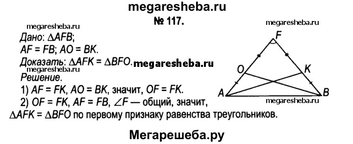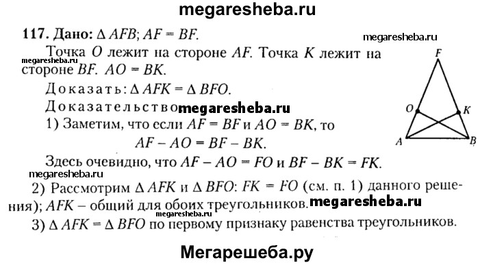 117. На равных сторонах AF и BF треугольника AFB лежат соответственно точки О и К так, что АО = ВК. Докажите, что треугольник AFK равен треугольнику BFO.