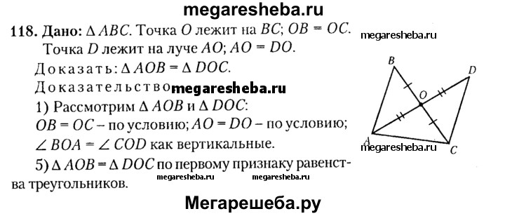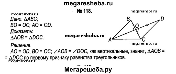 118. Точка О является серединой стороны ВС треугольника ABC, а точка D лежит на луче АО так, что точка О является серединой отрезка AD. Докажите, что треугольники АОВ и DOC равны.