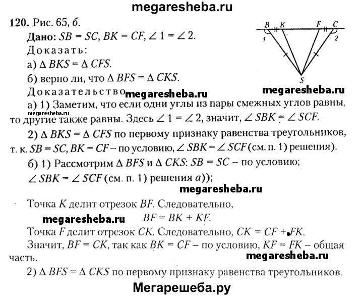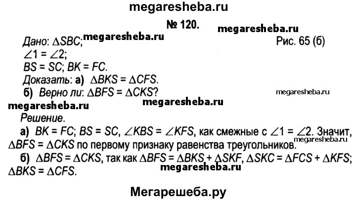 120. На рисунке 65, б SB = SC, ВК = CF, угол 1 = углу 2. а) Докажите, что треугольник BKS равен треугольнику CFS. б) Верно ли, что треугольники BFS и CKS равны?