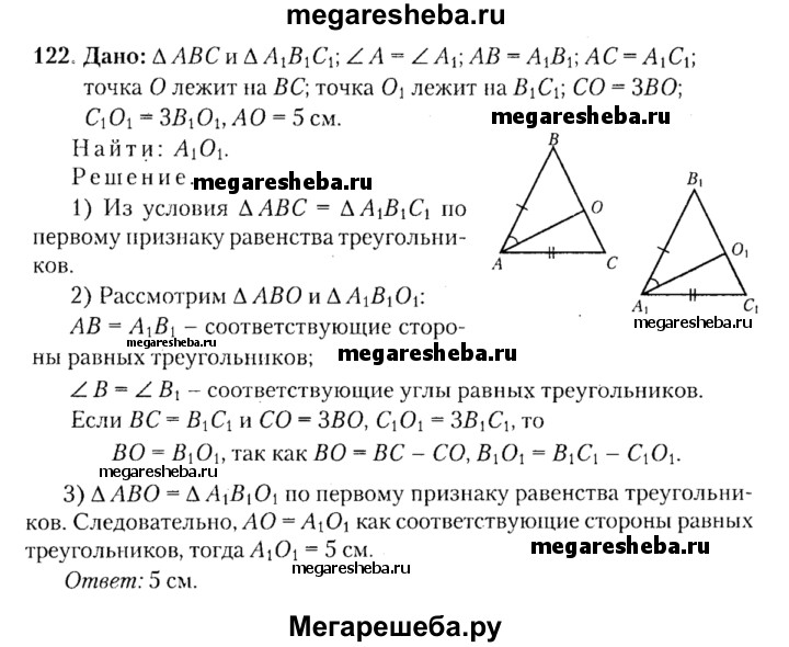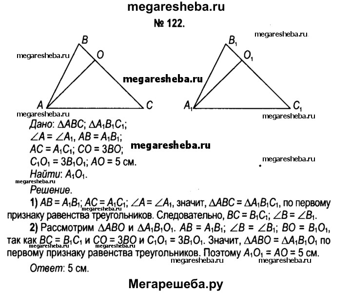 122. В треугольниках ABC и А₁В₁С₁ угол A = углу A₁, АВ =А₁В₁, АС = А₁С₁. Точки О и О₁ лежат на сторонах ВС и В₁С₁ соответственно, СО= 3ВО, С₁О₁= 3В₁О₁. Вычислите длину отрезка A₁O₁ если АО = 5 см.