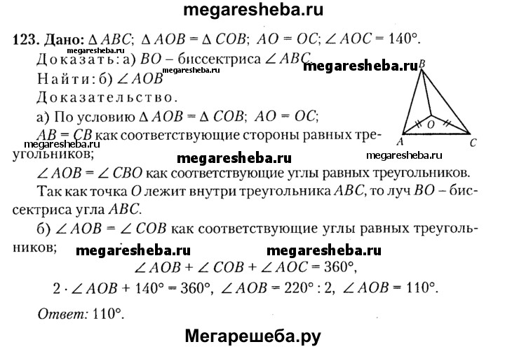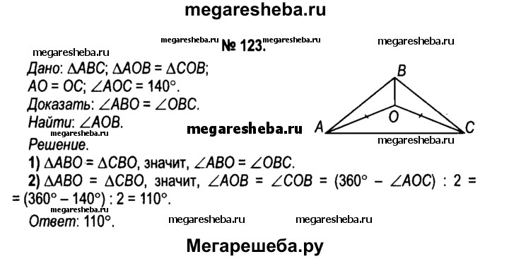 123. Точка О лежит внутри треугольника ABC так, что треугольник АОВ равен треугольнику СОВ, АО = ОС, угол AOC= 140°. Докажите, что луч ВО является биссектрисой угла ABC, и вычислите градусную меру угла АОВ.