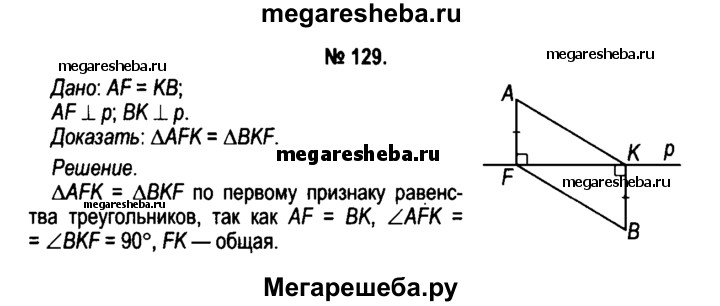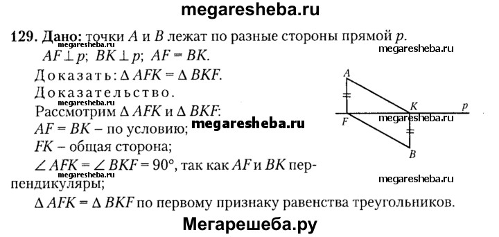 129. Точки А и В лежат по разные стороны от прямой р. Перпендикуляры AF и ВК к прямой р равны, а точки F и К не совпадают. Докажите, что треугольники AFK и BKF равны.