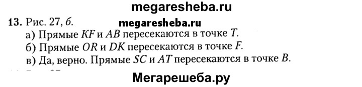 13. Рассмотрите рисунок 27, б. а) Назовите точку пересечения прямых KF и АВ. б) В какой точке пересекаются прямые OR и DK? в) Верно ли, что прямые SC и AT пересекаются в точке В?