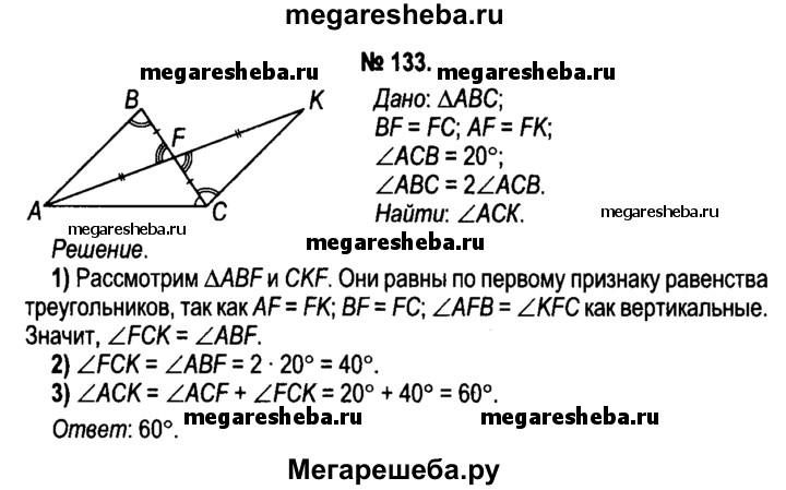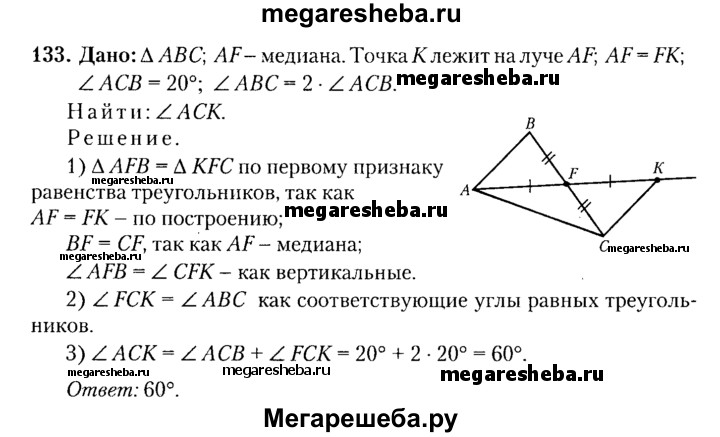 133. В треугольнике ABC отрезок AF — медиана. Точка К лежит на луче AF так, что AF = FK. Вычислите градусную меру угла АСК, если известно, что угол ACB = 20°, угол ABC = 2 угла ACB.