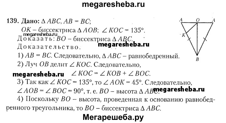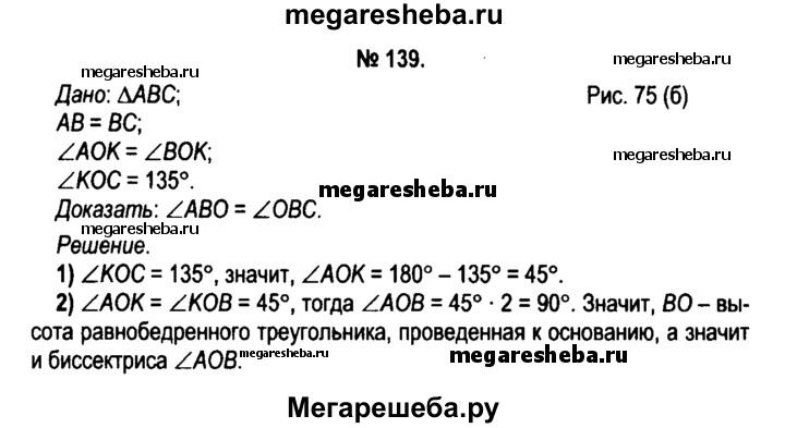139. На рисунке 75, б АВ = ВС, отрезок ОК — биссектриса треугольника АОВ. Докажите, что отрезок ВО — биссектриса треугольника ABC, если угол KOC= 135°.