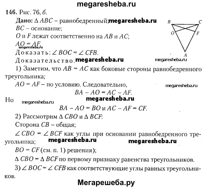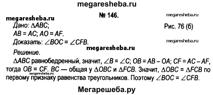 146. ABC — равнобедренный треугольник с основанием ВС. Точки О и F лежат соответственно на сторонах АВ и АС так, что АО = AF. Докажите, что угол ВОС равен углу CFB (рис. 76, б).