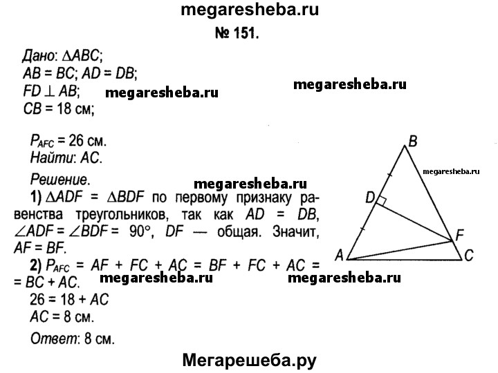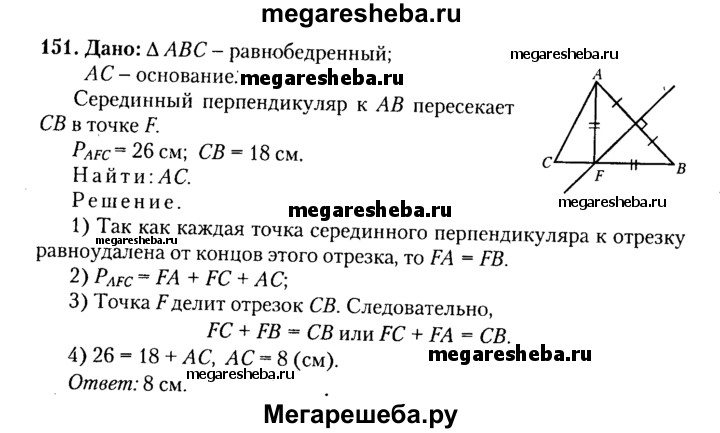 151. Серединный перпендикуляр к стороне АВ равнобедренного треугольника ABC пересекает сторону ВС в точке F. Вычислите длину основания АС треугольника, если периметр треугольника AFC равен 26 см, а СВ = 18 см.