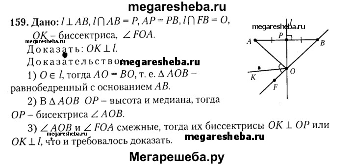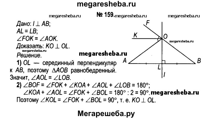 159. Серединный перпендикуляр I к отрезку АВ пересекает прямую FB в точке О так, что точка О лежит между точками F и В. Докажите, что биссектриса угла FOA перпендикулярна прямой I.
