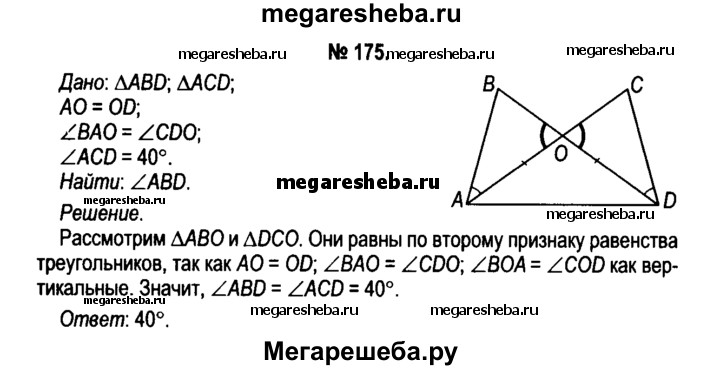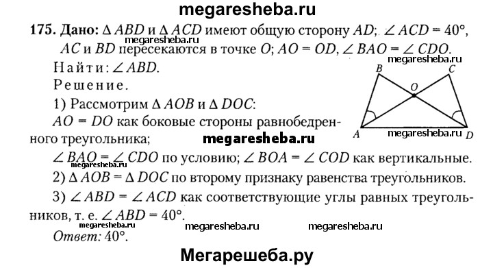 175. Треугольники ABD и ACD с общей стороной AD расположены в плоскости так, что их стороны АС и BD пересекаются в точке О, при этом АО = OD и угол BAO = углу CDO. Вычислите градусную меру угла ABB, если угол ACB = 40°.